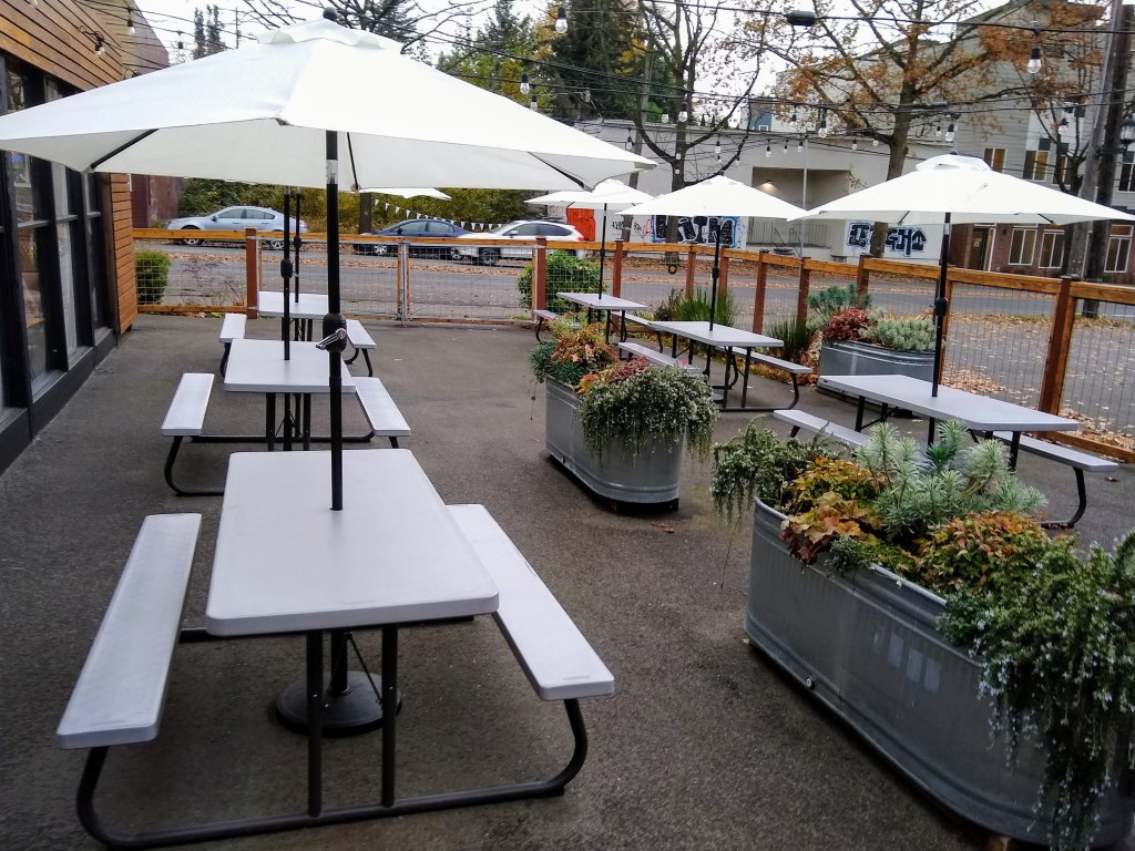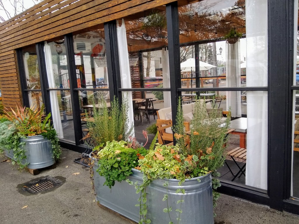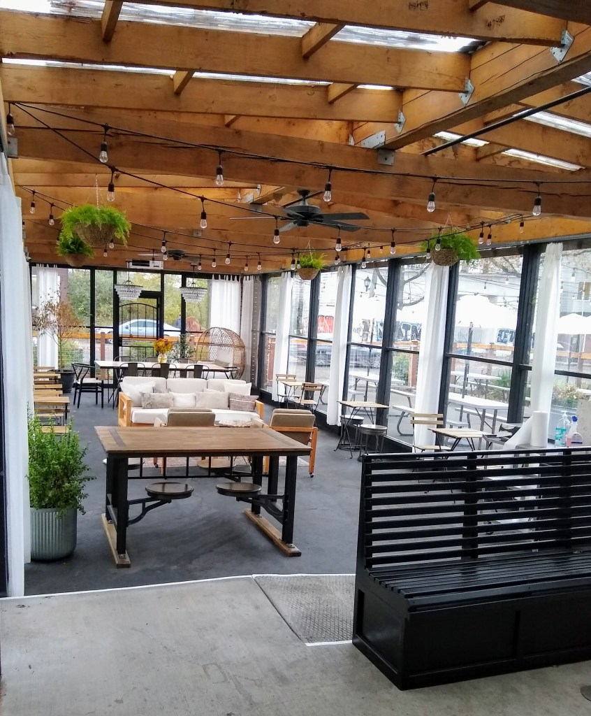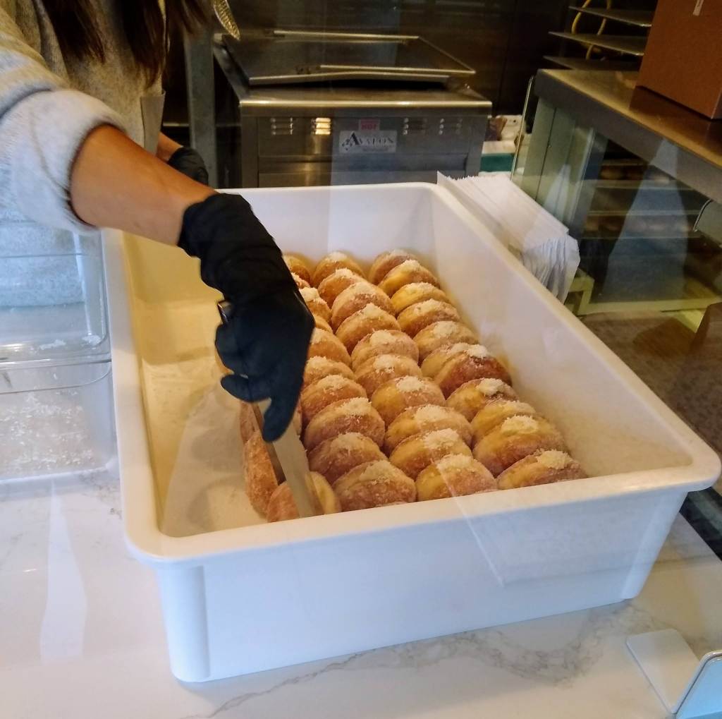 The Flour Box is definitely the most inviting donut shop we’ve visited with beautifully-designed indoor and outdoor seating. We’re certain this will be a great hangout location when when the pandemic is over. We even noticed cornhole boards in the covered area for some good old-fashioned entertainment.