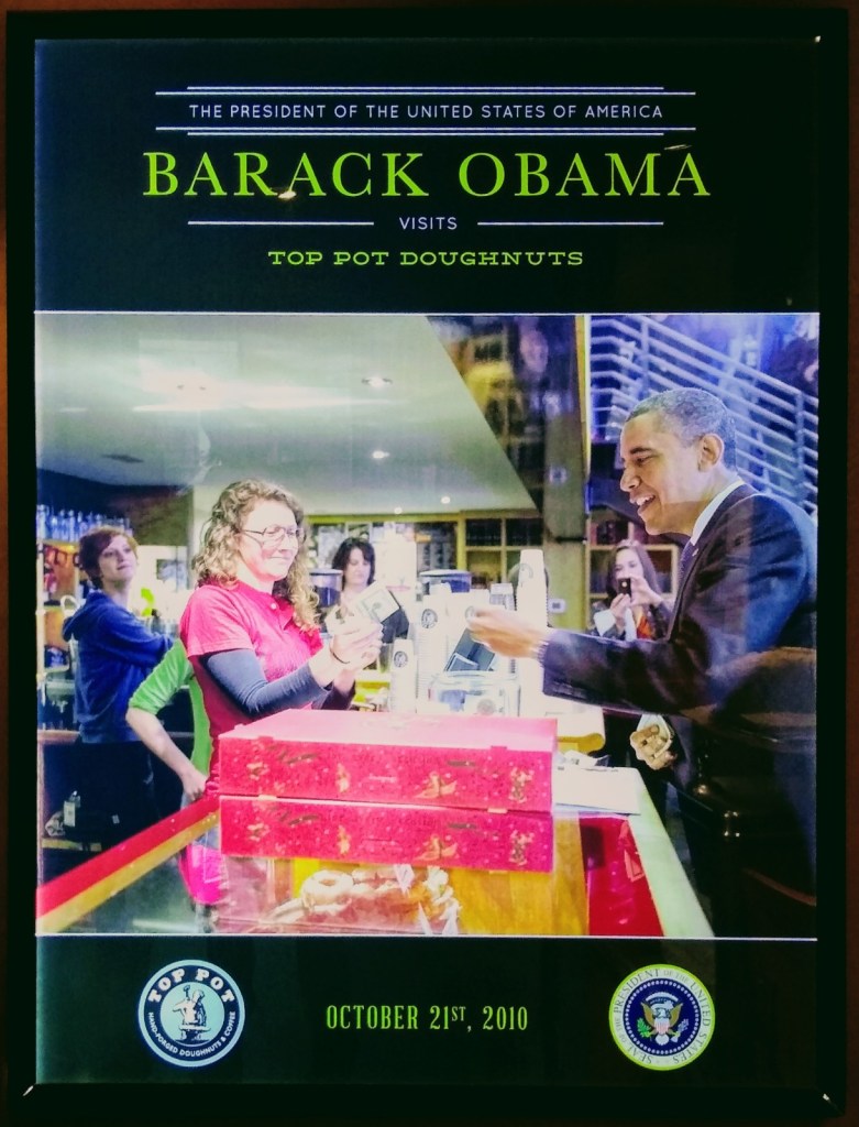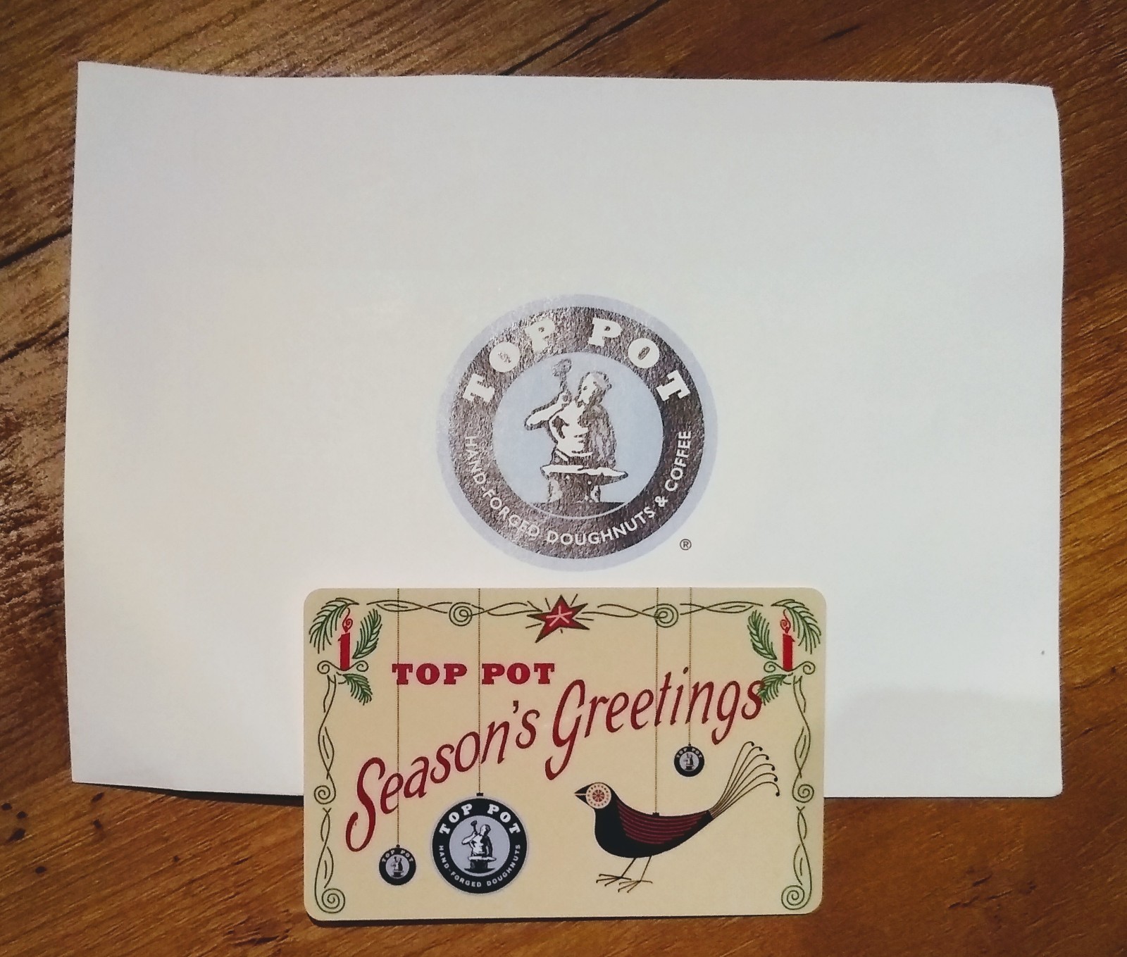 Top Pot Doughnuts is a Seattle mainstay and one cannot publish a donut blog without covering their acclaimed donut shops. This weekend we found the perfect opportunity to try out their Belltown location, funded by a Top Pot gift card giveaway from the Downtown Seattle Association’s #holidaylightsanddelights promotion. Top Pot has shown business acuity through its growing status as a regional chain donut restaurant (by our latest check, 19 and counting) and are several sports teams’ official doughnuts. You don’t even have to visit to one of their storefronts to get a taste of Top Pot Doughnuts! Their doughnut recipes are used and sold in QFC grocery stores throughout Seattle. In fact, Starbucks doughnuts are made with Top Pot recipes and are available at Starbucks all over the US and Canada.