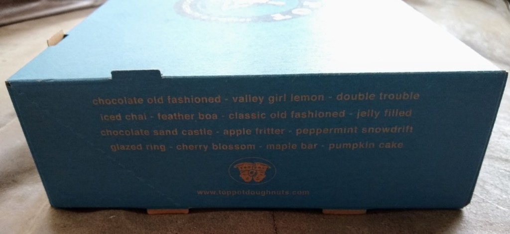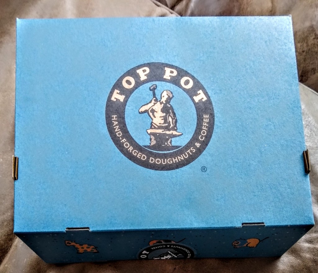 One of the more unique aspects of Top Pot Doughnuts is their box. It is the sturdiest box we have ever gotten for doughnuts, and handled the 2.2 pounds of doughnuts that we ordered with no chance of breakage. Their box is also nicely designed with their slogan “Hand-Forged Doughnuts & Coffee” and lists the majority of their flavors.